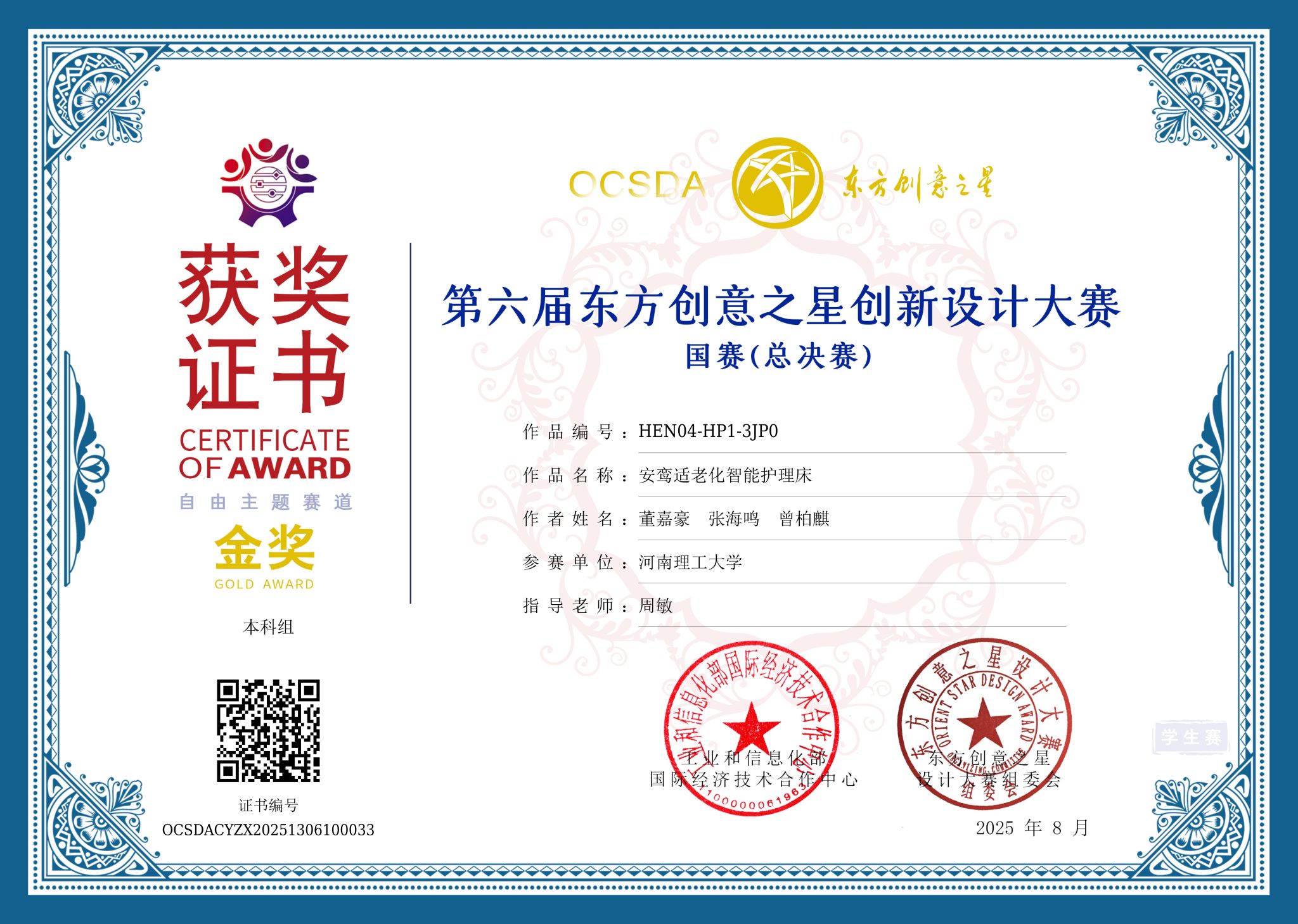 周敏老师指导的董嘉豪、张海鸣、曾柏麒团队完成的《安鸾适老化智能护理床》荣获赛事国赛金奖,周敏老师获得大赛优秀指导教师奖。
