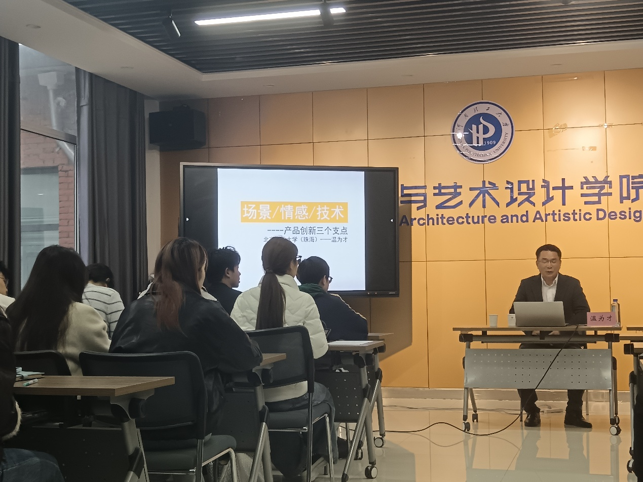 于学院楼大会议室举办“感受 场景 技术——产品创新设计三个要素”主题讲座,特邀北京理工大学(珠海)温为才教授主讲,工业设计系师生到场参会。